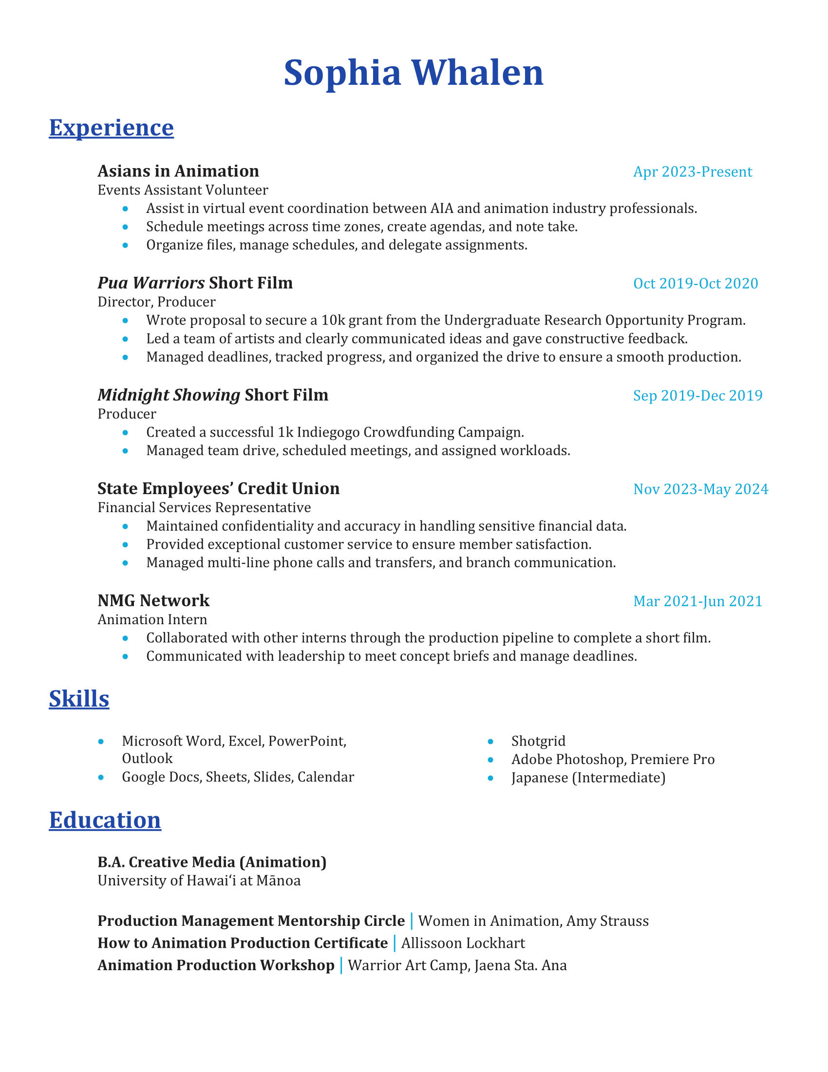 Hello!My name is Sophia, I'm a mixed Okinawan-Chinese American artist from Hawai'i with a BA in animation from the University of Hawai'i at Manoa.Previous work include animated short films: Sina Ma Tinirau, Pua Warriors, and Midnight Showing.Outside of work, I enjoy playing Dungeons and Dragons, occasionally DMing for my friends, reading isekai comics, and watching cool, new animated series.I'm available for animation production management work in TV, feature films, and games.